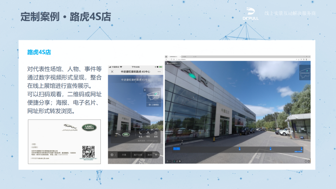 DEPULL德普视讯贯彻国家大数据战略,推进文化和科技深度融合;打破时间、空间传播阻隔,多媒体矩阵搭建传播新方式;我们利用计算机图形学的技术,构建各行业、各品牌数字化解决形态;以AR虚拟技术结合图片、视频、音频等立体互动形式,广泛用于:线上党建、线上博物馆、线上展厅等。
